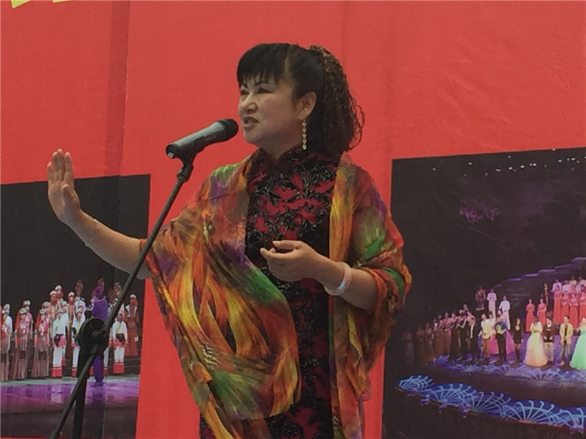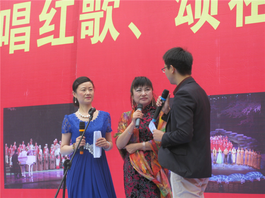 在演出开始前,省歌月光翎合唱团副团长李晓玉老师正在和主持人做交流。