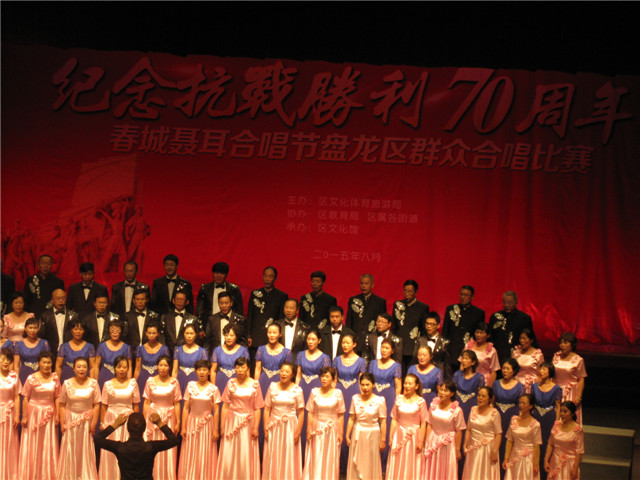 云南省歌舞剧院月光翎合唱团代表鼓楼街道办事处文化站参加了“纪念抗战胜利70周年春城聂耳合唱节盘龙区群众合唱比赛”得到了9.762分的高分,荣获第一名!
