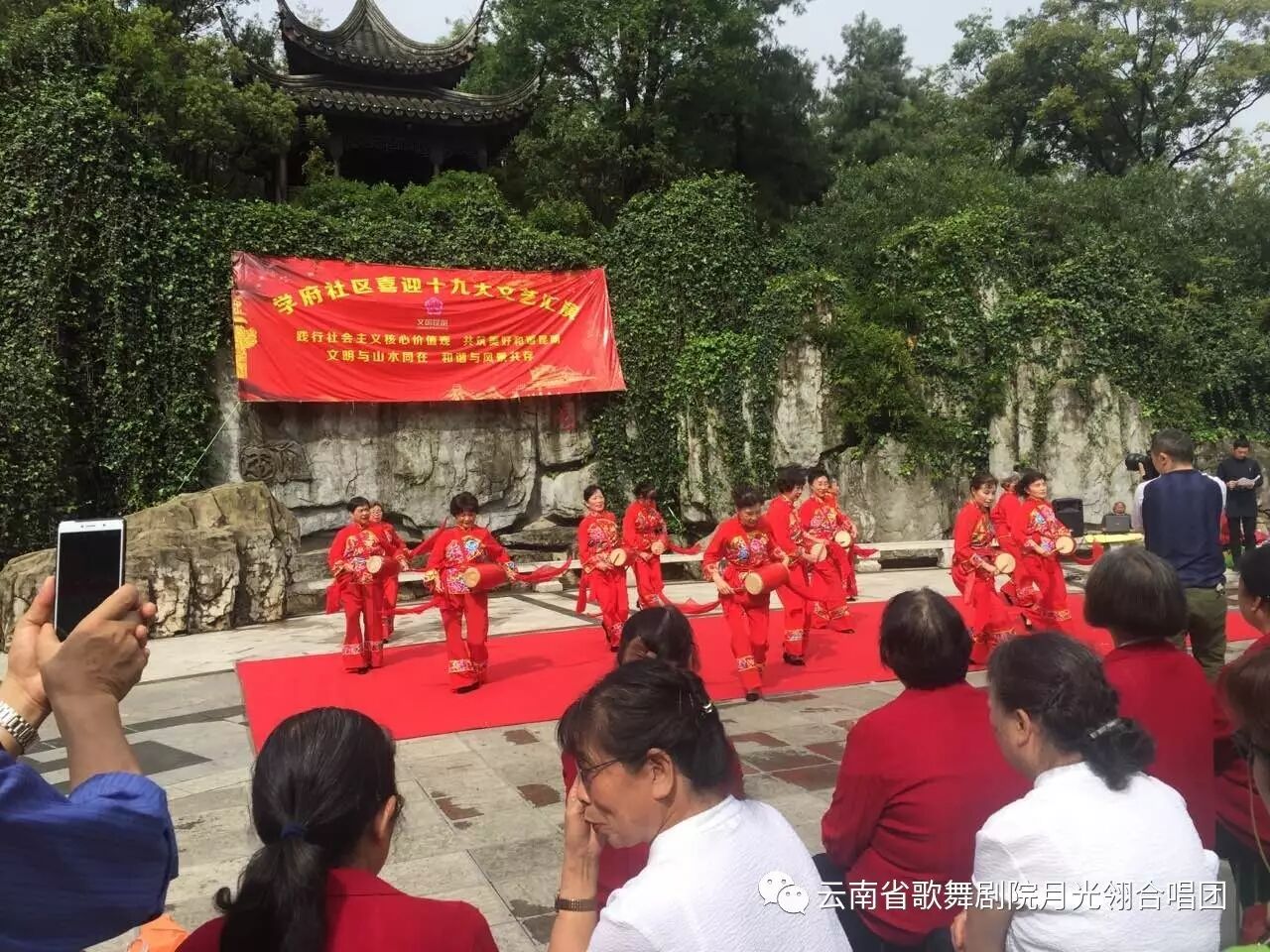 还没开场,社区居民们已经围满在舞台前,男女老少都来到了莲花池公园广场等着观看表演。