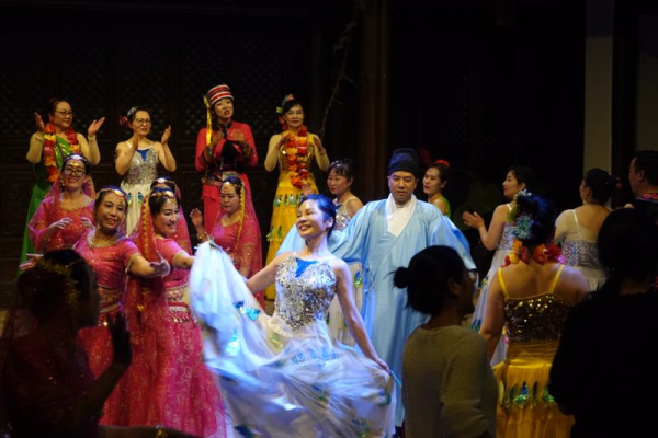 结束时,大家欢快的唱起了《远方的客人请你留下来》,合唱团员们邀请在座的嘉宾们载歌载舞,一起欢度了这个欢乐的泼水节夜晚。