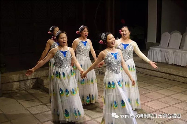 云南省歌舞剧院月光翎合唱团员从18岁至70岁都有,根据不同年龄李晓玉团长积极开拓,分批分类让团员们都能展示自我。年轻的团员们专门组织进行了圣诞节快闪演出,泼水节云南民歌专场演出。中老年朋友进行社区及福利院敬老院慰问。让到团的团员们充分展示自我演唱及表演水平。
