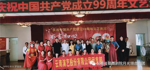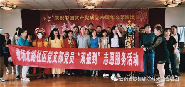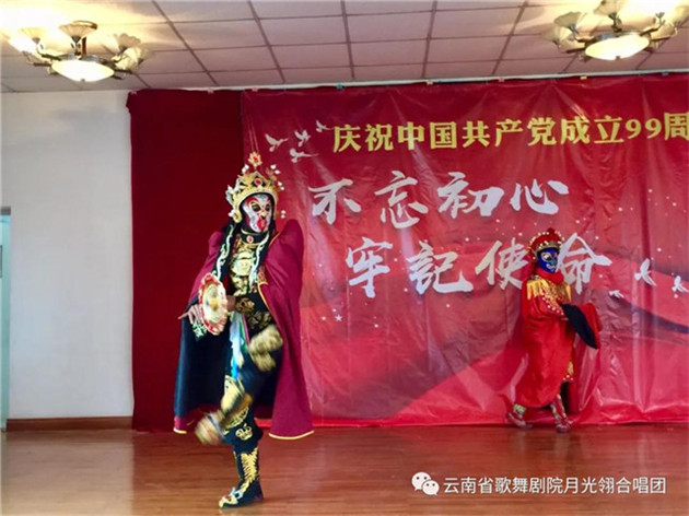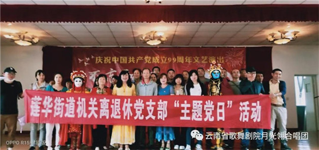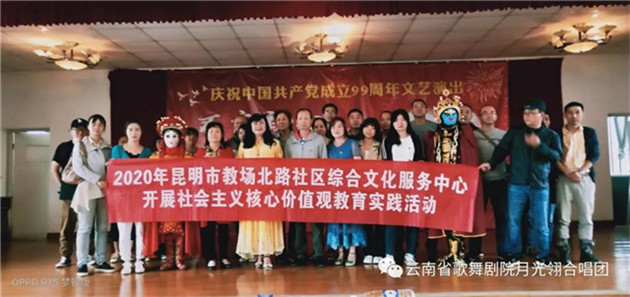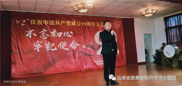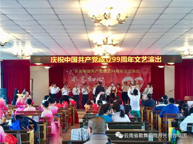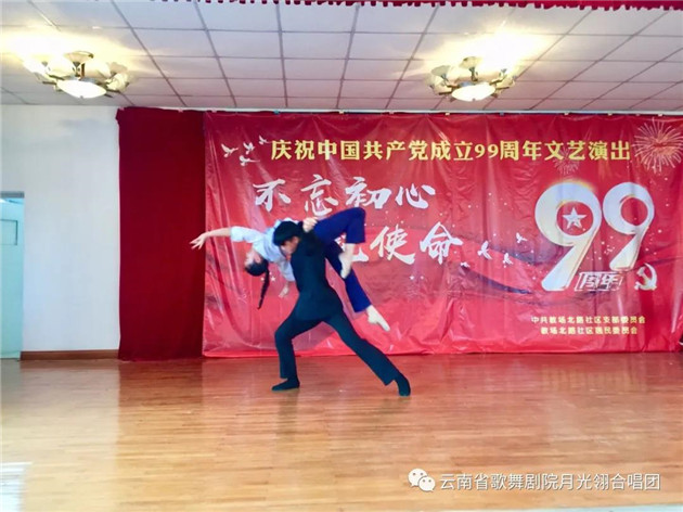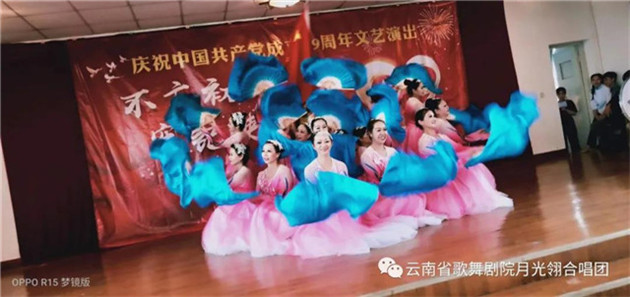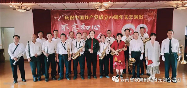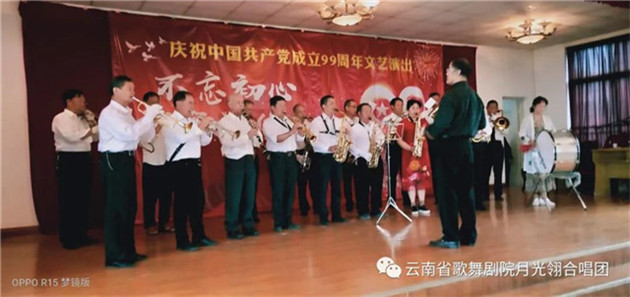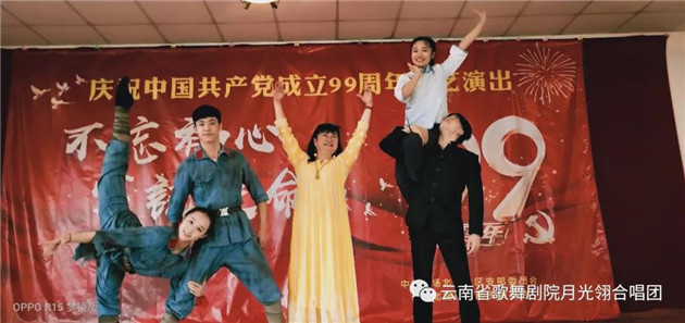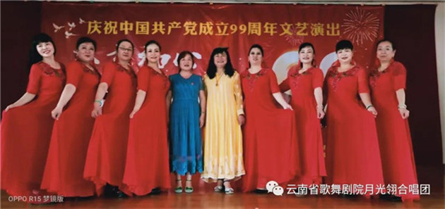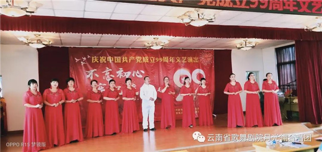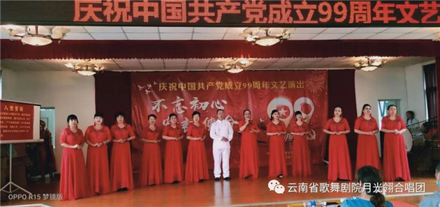 云南省歌舞剧院月光翎合唱团的团员在一个星期内,加排练练习《再唱山歌给党听》,以饱满、热情的歌声庆祝党的99周岁生日。