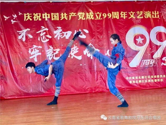 今天是党的生日,在之前的一周,莲华社区通知到我们省歌月光翎合唱团的李晓玉团长以后,我们李团长积极主动地跟云南省歌舞剧院陶院长,杨书记,钱副院长交流并得到了领导们的支持,选派了我们的青年演员参加了这一次的七一建党节的主题活动,虽然这些演员们身兼数职,一个是青年演员大赛,一个是新剧目的排练,仍然在百忙之中腾出时间来排练,积极地参与到这次的公益演出活动当中,最晚排练到凌晨才休息。他们表演了非常精彩的舞蹈《战士紧握手中枪》《与妻书》。